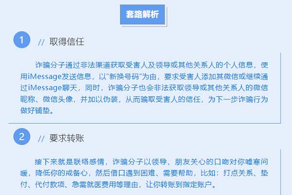 诈骗分子通过非法渠道获取受害人及领导或其他关系人的个人信息,使用iMessage发送信息,以“新换号码”为由,要求受害人添加其微信或继续通过iMessage聊天,同时,诈骗分子也会非法获取领导或其他关系人的微信昵称、微信头像,并加以伪装,从而骗取受害人的信任,为下一步诈骗行为做好铺垫。