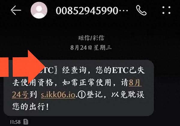 诈骗分子以ETC中心、高速管理中心等机构名义发送短信,以你的ETC无法继续使用,想要恢复使用就要重新认证的借口进行诈骗。