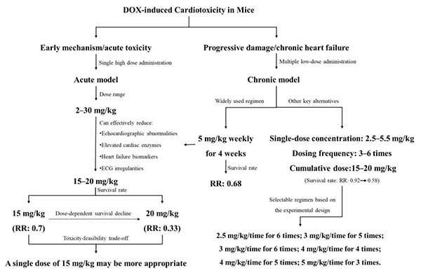 化疗药物,尤其是阿霉素,在挽救肿瘤患者生命的同时可能引发心脏损伤,严重影响患者预后及长期生存。由于目前缺乏有效疗法,在实验室阶段准确模拟并评估这种心脏损伤至关重要。小鼠因遗传可控、成本低且符合3R伦理原则成为首选动物,但过往实验中给药剂量差异很大:低剂量可能无法充分模拟心脏损伤,而高剂量则导致死亡率过高。这种不确定性阻碍了研究的标准化和结果的可信度。