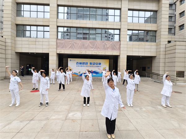 正午时分,伴随着悠扬的乐声,在东方医院工会组织下,治未病科全体医护人员在刘洋主任、张丽君护士长、王慧老师的带领下,于金银花广场旁整齐列队。“双手托天理三焦,左右开弓似射雕……”柔和的动作如行云流水,呼吸与招式相合,形成一道融贯传统与现代的健康风景线,吸引了医院员工及患者家属驻足观看,甚至自发加入练习行列。