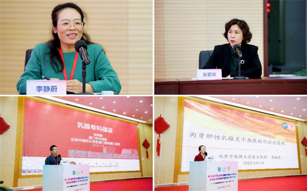 “精准施策,共识领航”板块由首都医科大学附属北京中医医院张董晓教授、山东中医药大学附属医院李静蔚教授主持。厦门市中医院陈隽鹏教授分享乳腺专科建设经验,围绕“医教研”模式提升学科实力;北京中医药大学第二临床医学院(东方医院)乳腺科李桃花教授介绍肉芽肿性乳腺炎中西医结合分型治疗策略,其中介绍了东方医院经验:中医药贯穿全程,中西医结合策略分型治疗,并通过临床病例详解手术技巧;刘豫玥教授解读《肉芽肿性小叶性乳腺炎病理诊断中国专家共识(2024版)》,规范疾病定义与诊断模式,为精准治疗提供依据。