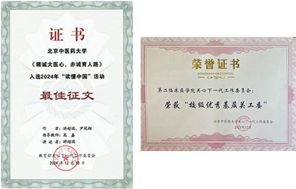 北京中医药大学第二临床医学院(东方医院)关心下一代工作委员会荣获教育部奖项1项、校级奖项3项:由教育处高嘉老师指导,游超瑞、尹冠翔同学完成的征文《精诚大医心,赤诚育人路》荣获教育部关心下一代工作委员会最佳征文、校级征文一等奖,由教育处高嘉老师指导,游超瑞、任耕庆、尹冠翔同学微视频《教育强国,奋斗有我-东方医院刘大新教授采访视频》获校级三等奖。医院关工委荣获“校级优秀基层关工委”称号。北京中医药大学关心下一代工作委员会换届大会上对2024年“读懂中国”活动省部级、校级获奖情况进行通报和表彰。