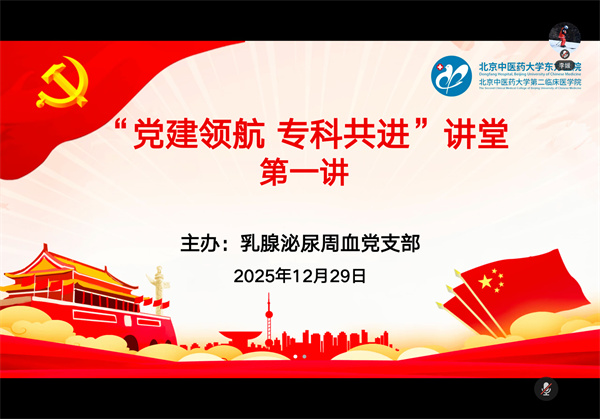 近日,由北京中医药大学第二临床医学院(东方医院)乳腺泌尿周血党支部主办的“党建引领 专科共进”讲堂第一讲正式启动。讲堂以线上形式呈现,乳腺泌尿周血党支部全体党员、积极分子,以及乳腺科、泌尿科、周围血管科、男科等科室医护人员、研究生参会。启动仪式由乳腺泌尿周血党支部书记李桃花主持,副院长赵海滨出席并致辞。
