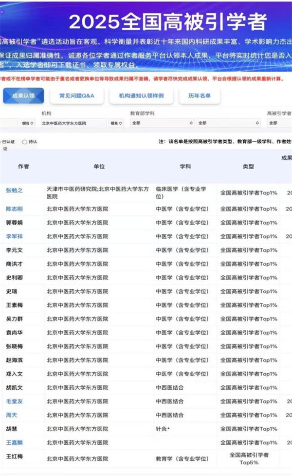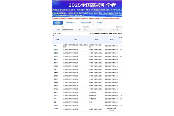 近日,北京中医药大学第二临床医学院(东方医院)共有19位学者入选由中国知网下属的中国科学文献计量评价研究中心(出版智库)发布的2025年“中国知网高被引学者”名单,其中TOP1%学者18人,TOP5%学者1人。