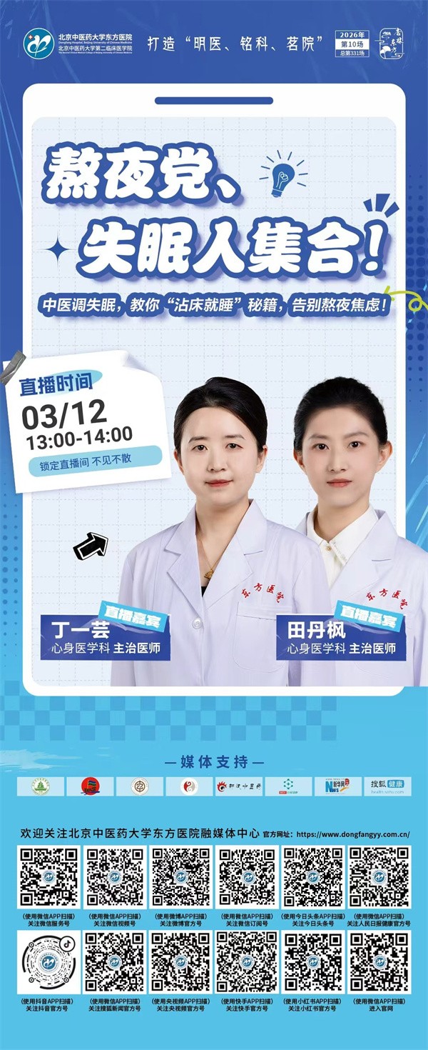 3月12日,主治医师丁一芸、主治医师田丹枫在杏林东方第一直播间开展《中医调失眠,教你“沾床就睡”秘籍》专题直播,解析睡眠生理机制及情绪对睡眠的干扰,传授腹式呼吸、渐进式肌肉放松等实用技巧,并通过互动答疑解决观众困惑。